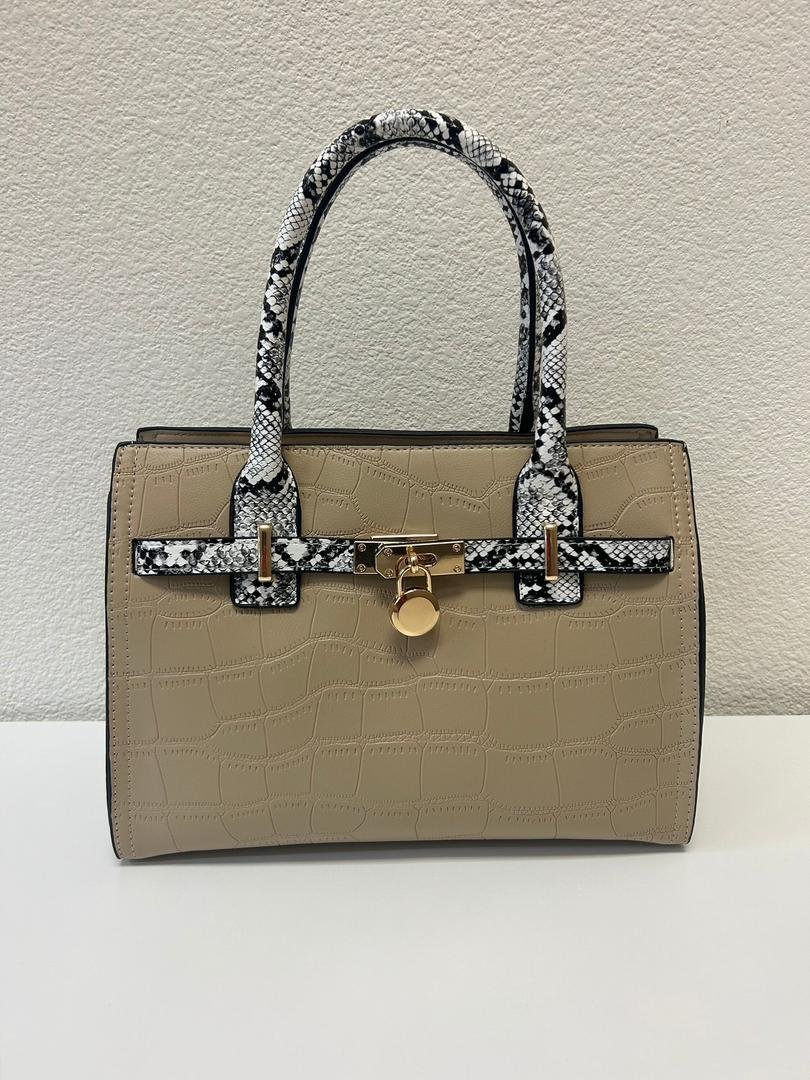 Apportez une touche de sophistication à votre garde-robe avec cet ensemble chic comprenant un sac à main structuré et sa pochette assortie. Parfait pour la femme moderne, ce sac allie l’aspect luxueux de la texture crocodile au design audacieux des anses à motif serpent.